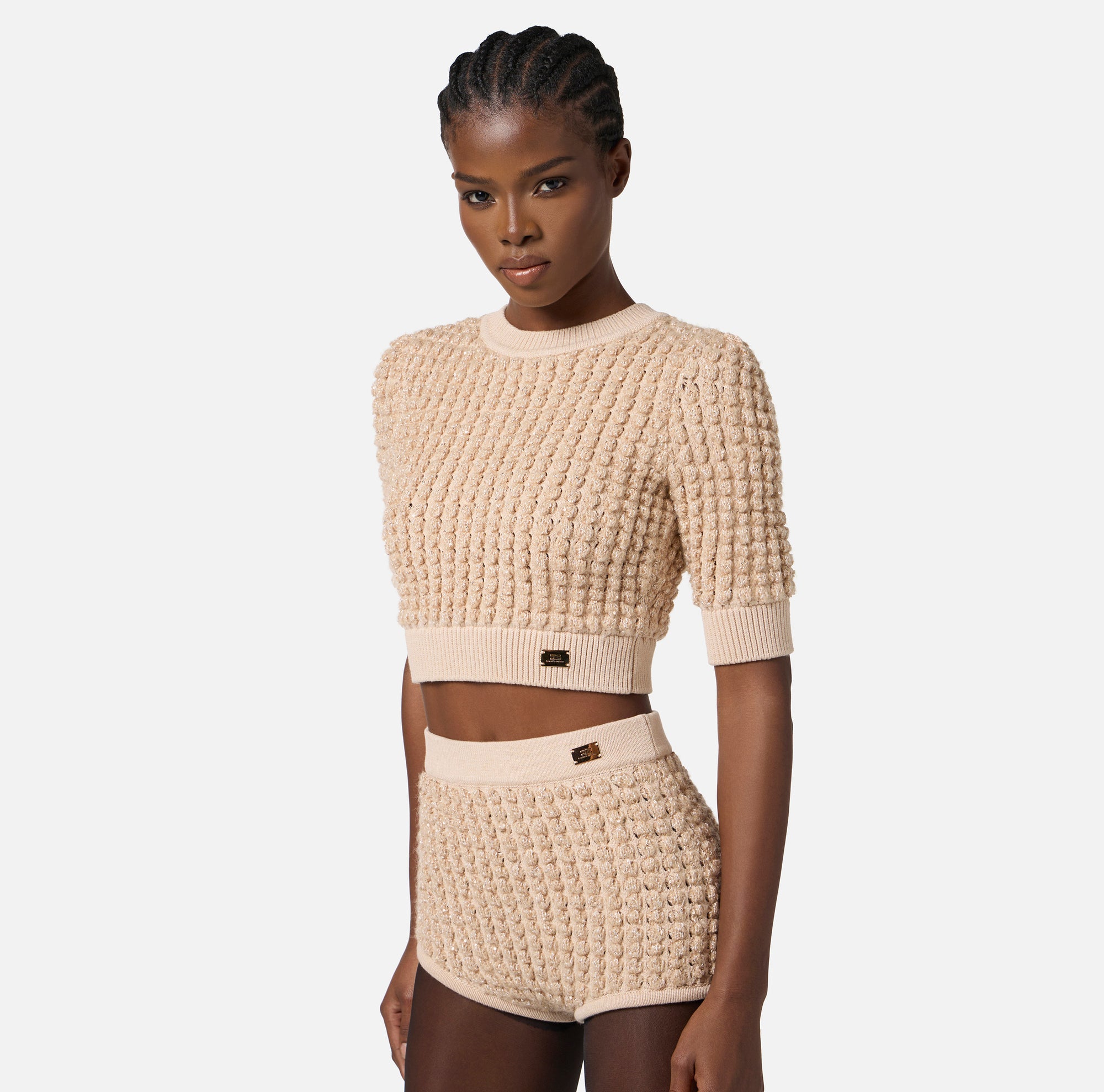 Elisabetta Franchi Top in Maglia Bouclé con Paillettes Miele
