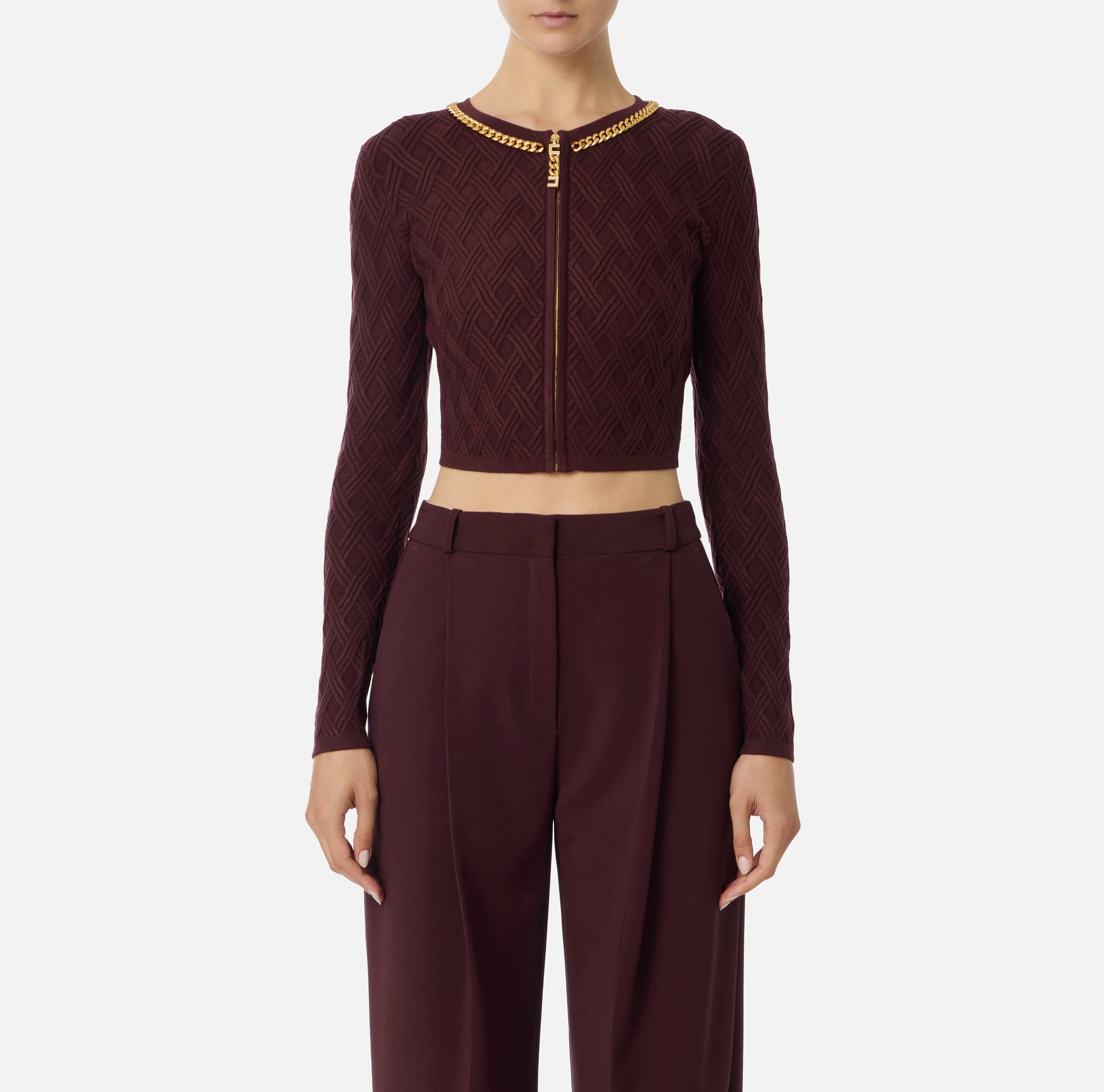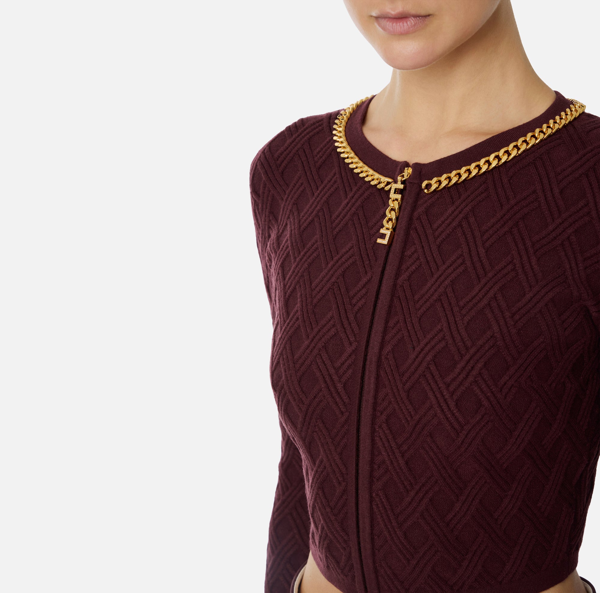 Elisabetta Franchi Cardigan in Maglia a Rombi con Dettaglio Gioiello Merlot